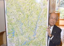 広域観光を実現するため、奥相模の山や川などの観光資源を描いた鳥観図(ちょうかんず)「奥さがみ道志・桂川 散策絵図」。観光振興に尽力する相模原商工会議所副会頭で北辰企業社長の原幹朗さん(75)が構想から3年ほどかけて自費で企画制作し、このほど完成し相模原市の本村賢太郎市長に寄贈した。原さんは「この鳥観