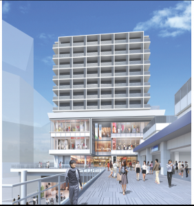 工事敷地面積が約3600平方㍍。1~4階を商業施設、5~11階が賃貸住宅になる。2階部分を駅のコンコースやペデストリアンデッキと直結させる。