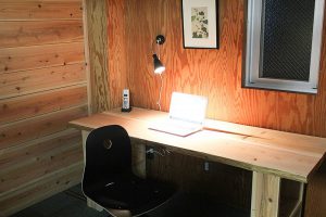 ブースやデスク、カウンター、いずは、サトウ草木(相模原市緑区青根)が提供した津久井産の間伐材(スギ、ヒノキ)を使って製作。地元の木材の紹介、木材や家具を展示・販売する地産材活用のPR拠点としての役割も担っている。