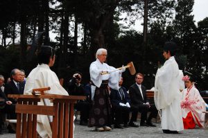 地鎮祭には約60人が出席。供え物をささげ、祝詞を奏上した後、根岸宮司が「うがち初め」をするなど、工事の安全を祈願した。