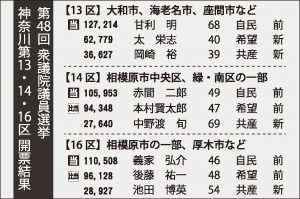 第48回衆院選は、10月22日に投開票が行われた。神奈川13区は自民の甘利が圧勝。14区は自民の赤間が前回同様に選挙区を制した。16区は前回比例復活の自民の義家が、希望の後藤に選挙区で競り勝った。(敬称略)