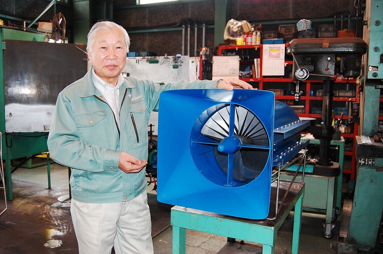 発電機の本体部分は、1枚のステンレス鋼板を、らせん状に加工。この羽根が1分間に500回転して発電する仕組み。
