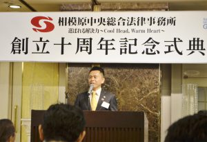 相模原中央総合法律事務所(中央区相模原)はこのほど、ラポール千寿閣(南区上鶴間本町)で創立10周年記念式典を行った。本村賢太郎市長や石川将誠市議会議長ら約140人が集い、祝杯を挙げた。