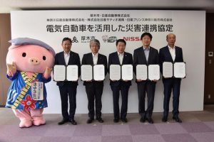 厚木市と日産自動車(横浜市西区)、神奈川日産自動車(同)、日産サティオ湘南(平塚市)、日産プリンス神奈川販売(横浜市神奈川区)の5者はこのほど、災害時に電気自動車(EV)を活用した電力供給に関する協定を締結した。災害で停電が起きたときなど、リーフなど電気自動車を電源として貸し出す。自治体との連携は10件目。【2019年11月10日号掲載】