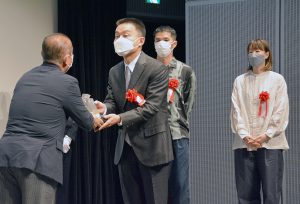 本村市長から表彰を受ける鎌田氏と、新人賞の岸さん、中井さん(右)