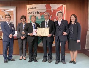 本村市長に目録を手渡す山本さん(右から3人目)、尾作さん、平岩さん