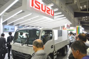 22年5月に横浜市西区のみなとみらい地区へ移転したばかりの「いすゞ(ず)自動車」も、3月にフルモデルチェンジした小型トラック「エルフ」を展示。AT車は従来、シングルクラッチの6速AMT(自動化した手動変速機)を搭載していたが、新型では9速DCT(デュアルクラッチトランスミッション)の「ISIM」に変更。エンジンの回転数を抑えて燃費を改善するほか、変速時の駆動力の途切れを大幅に少なくし、スムーズな加速を実現した。