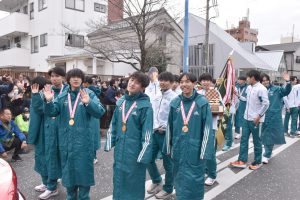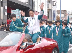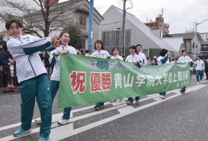 ことしの第100回箱根駅伝で往復路を制し、10時間41分25秒の総合新記録の完全優勝で2年ぶり7度目の頂点に立った青学大陸上競技部の優勝報告会、パレードが1月28日、練習拠点としている相模原キャンパス(中央区淵野辺)の最寄り駅であるJR淵野辺駅周辺で行われた。沿道には約3万3000人のファンが詰めかけ新記録での優勝をたたえた。【2024年2月10日号掲載】