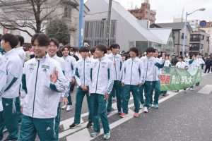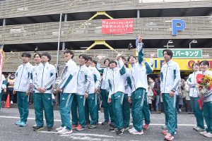 パレードは約300メートルを、同大応援団と吹奏楽バトントワリング部が先導し、原監督と志貴主将がオープンカーに乗り、ファンの声援に応じながら、この後を選手らが練り歩いた。