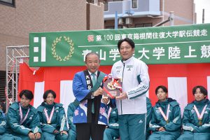 優勝報告会で、原晋監督は「4年ぶりにこの男、このチームが帰ってきました」と第一声をあげた。今回のチーム作戦名は「負けてたまるか大作戦」。原監督は「箱根駅伝は何が起きるか分からない。人生も何が起きるか分かりません。負けと思ったら負けです。これからも負けてたまるか大作戦と称して、人生ハッピーに頑張っていきましょう」と会場を盛り上げた。