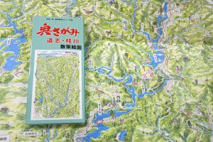 奥相模は旧津久井郡4町の地域。鳥観図とは上空から鳥が見下ろしたように描いた地図のこと。富士五湖の1つで相模川の源流である山梨県の山中湖から発する桂川流域、同県道志村の水源の森から発する道志川流域を中心に津久井湖周辺まで1枚の立体的な絵地図として描かれている。