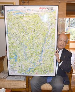 広域観光を実現するため、奥相模の山や川などの観光資源を描いた鳥観図(ちょうかんず)「奥さがみ道志・桂川 散策絵図」。観光振興に尽力する相模原商工会議所副会頭で北辰企業社長の原幹朗さん(75)が構想から3年ほどかけて自費で企画制作し、このほど完成し相模原市の本村賢太郎市長に寄贈した。原さんは「この鳥観図が独り歩きしてくれて、広域観光の実現につながればうれしい」と期待している。【2024年2月10日号掲載】