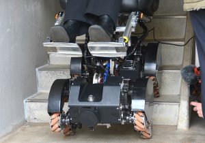狭く急な階段でも自走で上り下りできる車いすロボ