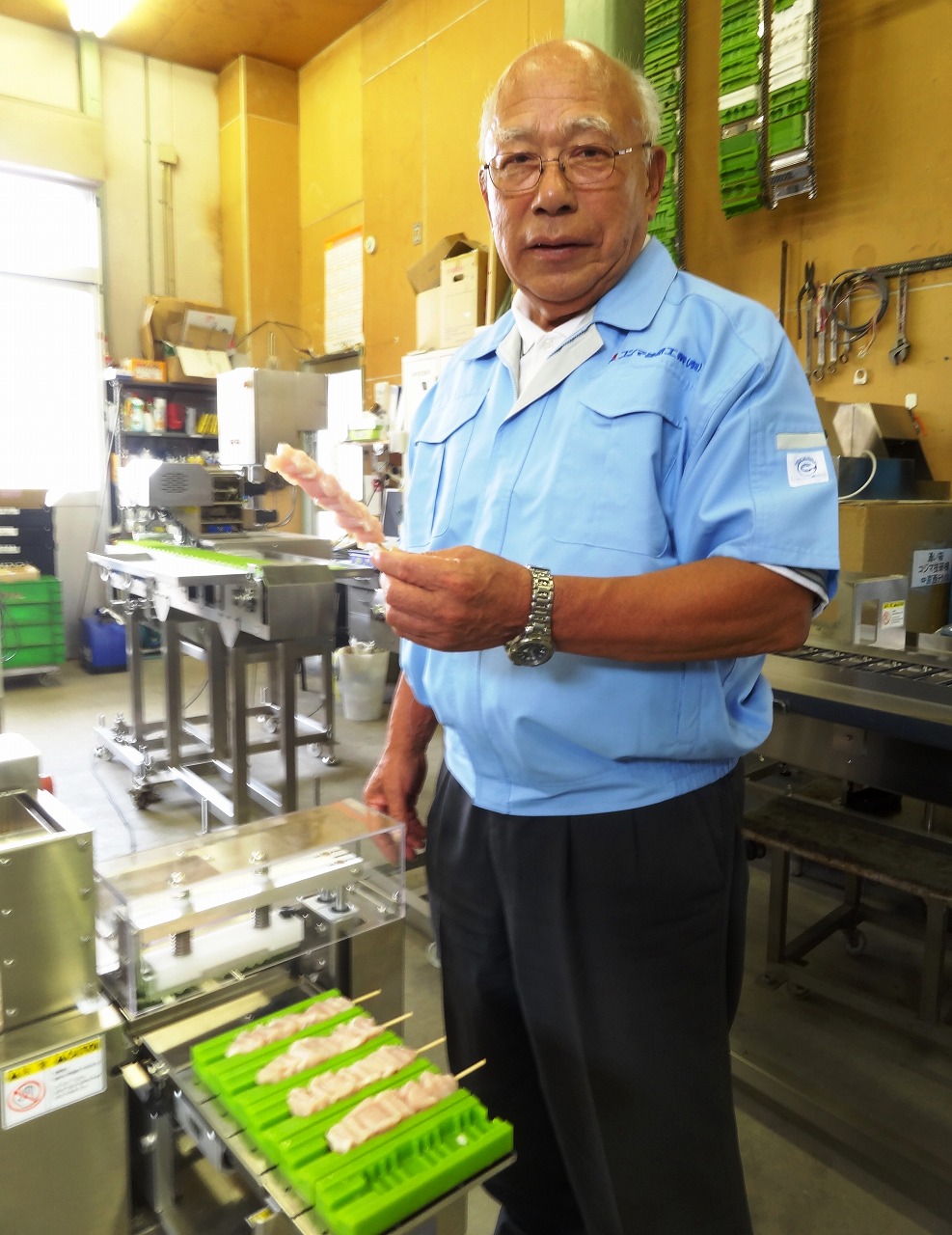 焼き鳥、串カツ、おでん、団子…。どんな食材も串刺しにする自動串刺機市場で、国内市場シェア9割以上を独占する企業が相模原市中央区にある。社員数わずか5人のコジマ技研工業だ。同社の自動串挿機は、今や世界中に輸出されている。アジアや南米など、〝串料理〟がある国からの引き合いが絶えない。ただ、ここまでの道のりは決して平たんではなかった。創業者の小嶋實社長(80