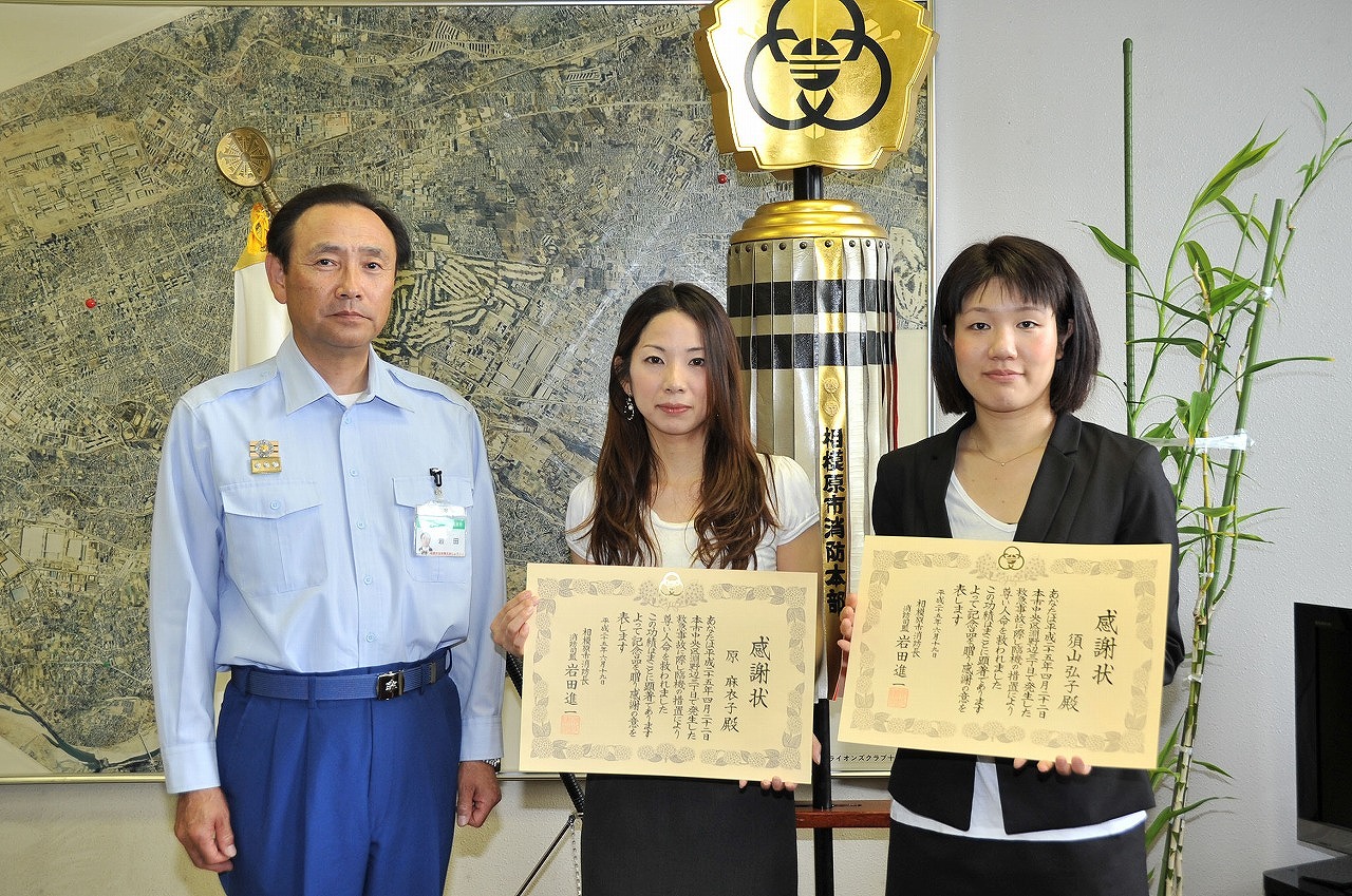 感謝状の贈呈式は相模原消防署で行われた。須山さんと原さんが同署を訪れ、岩田進一消防局長が感謝状を手渡した。