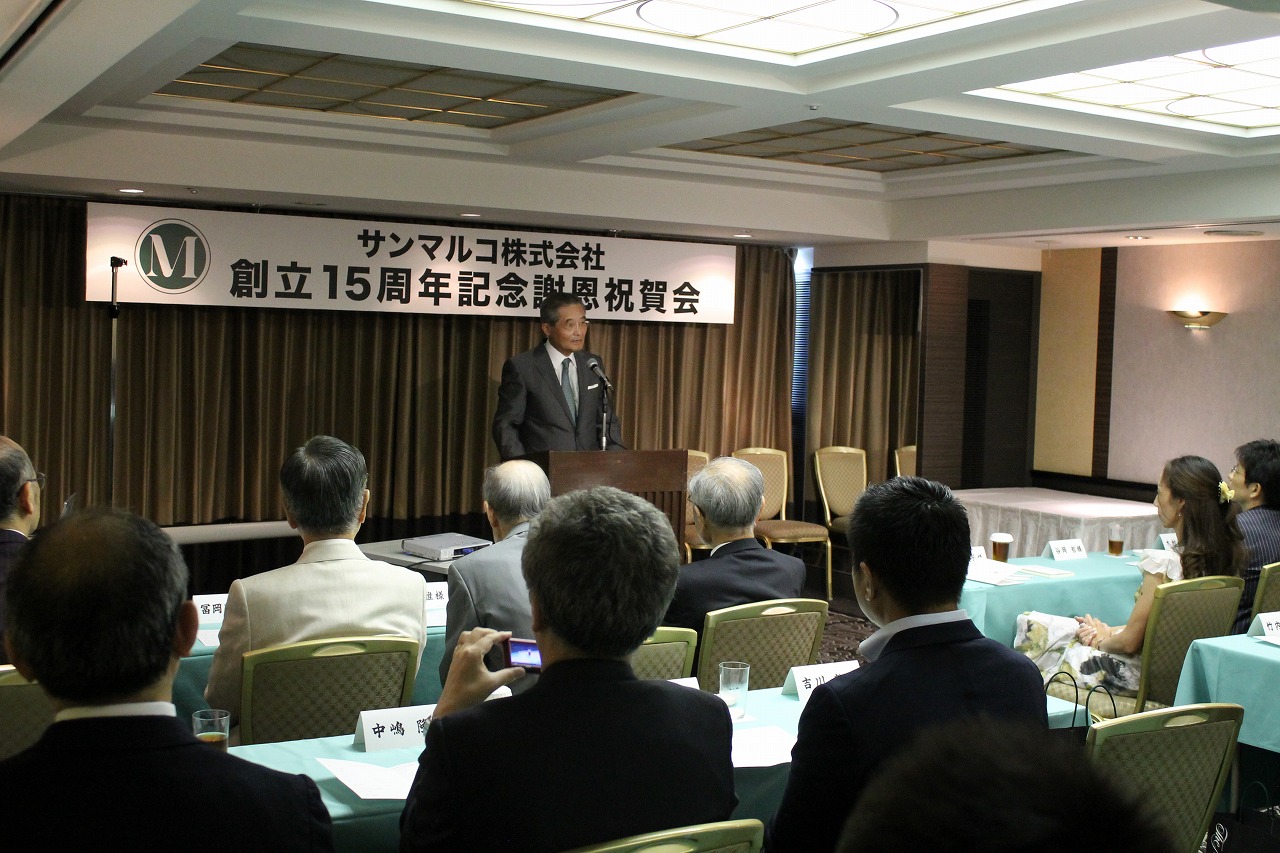 ガラスフィルム販売のサンマルコ(相模原市緑区橋本台)は3日、東京都港区のホテルニューオータニで「創立15周年記念謝恩祝賀会」を開いた。社員や取引先、協力会社など計41人が出席した。