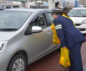 同署員や相模原交通安全協会などの会員40人が、信号で停止した車両に対し、「飲酒運転や交通事故はいかん」の語呂合わせでミカンを配布。約500セット用意された広報物を約15分で配り終えた。