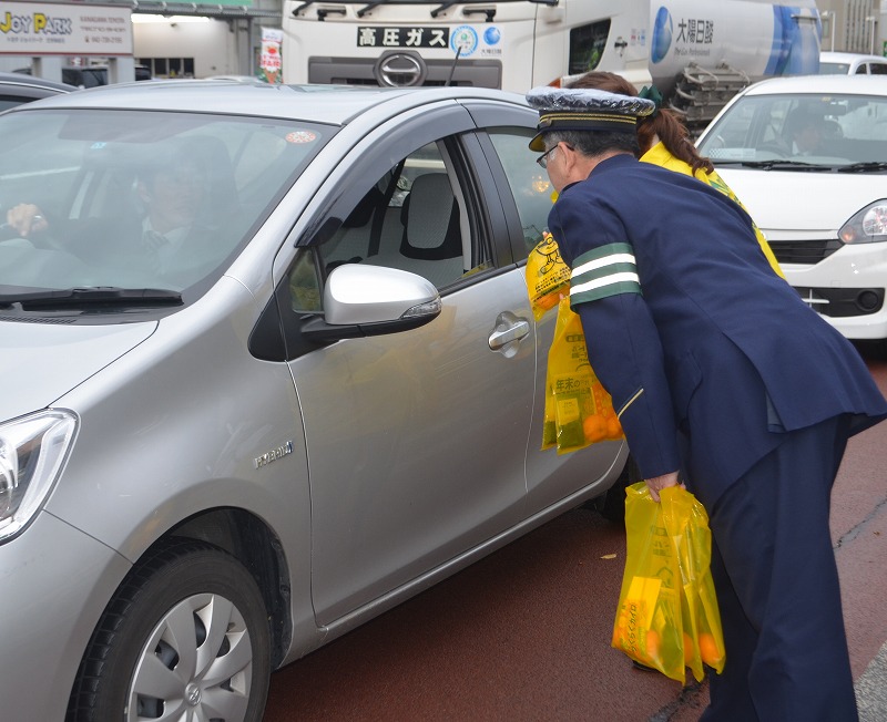 11日には、飲酒運転や交通事故の防止を呼び掛ける「いかん、みかん」キャンペーンが国道16号の同署前の交差点で行われた。「年末の交通事故防止運動期間」の初日にもあたる。