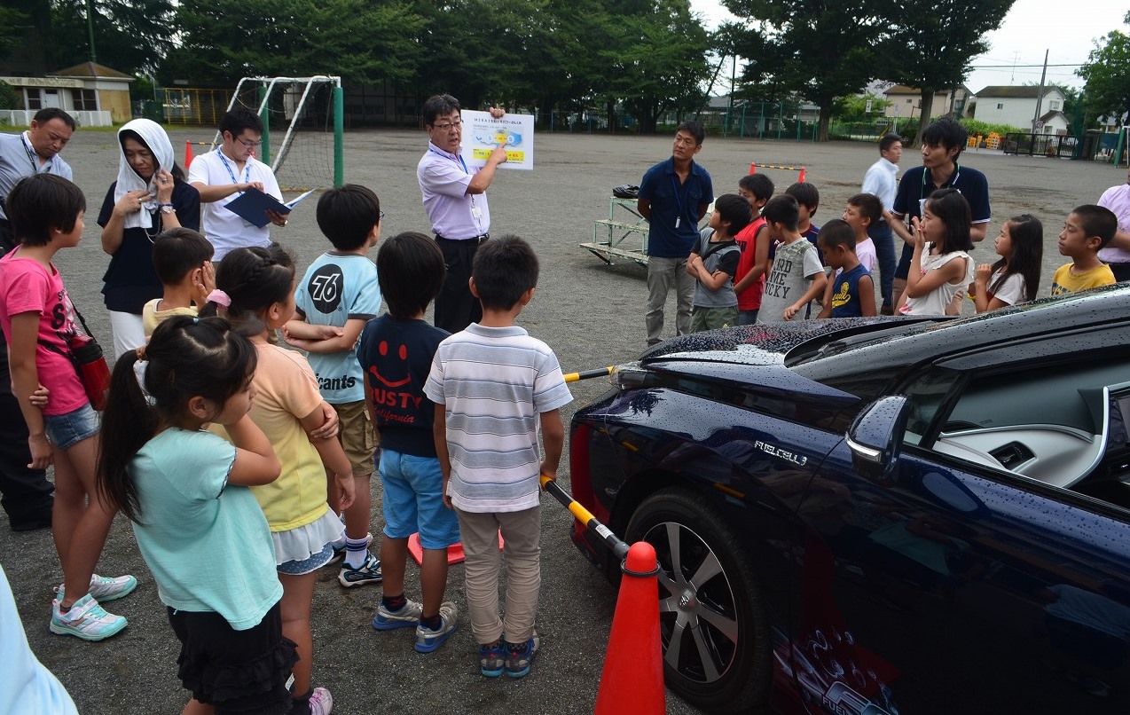 ミライを使用した実験では、燃料電池車の仕組みを学んだ。後部の管から「水」が排出されると、子供たちは驚きの声を上げた。
