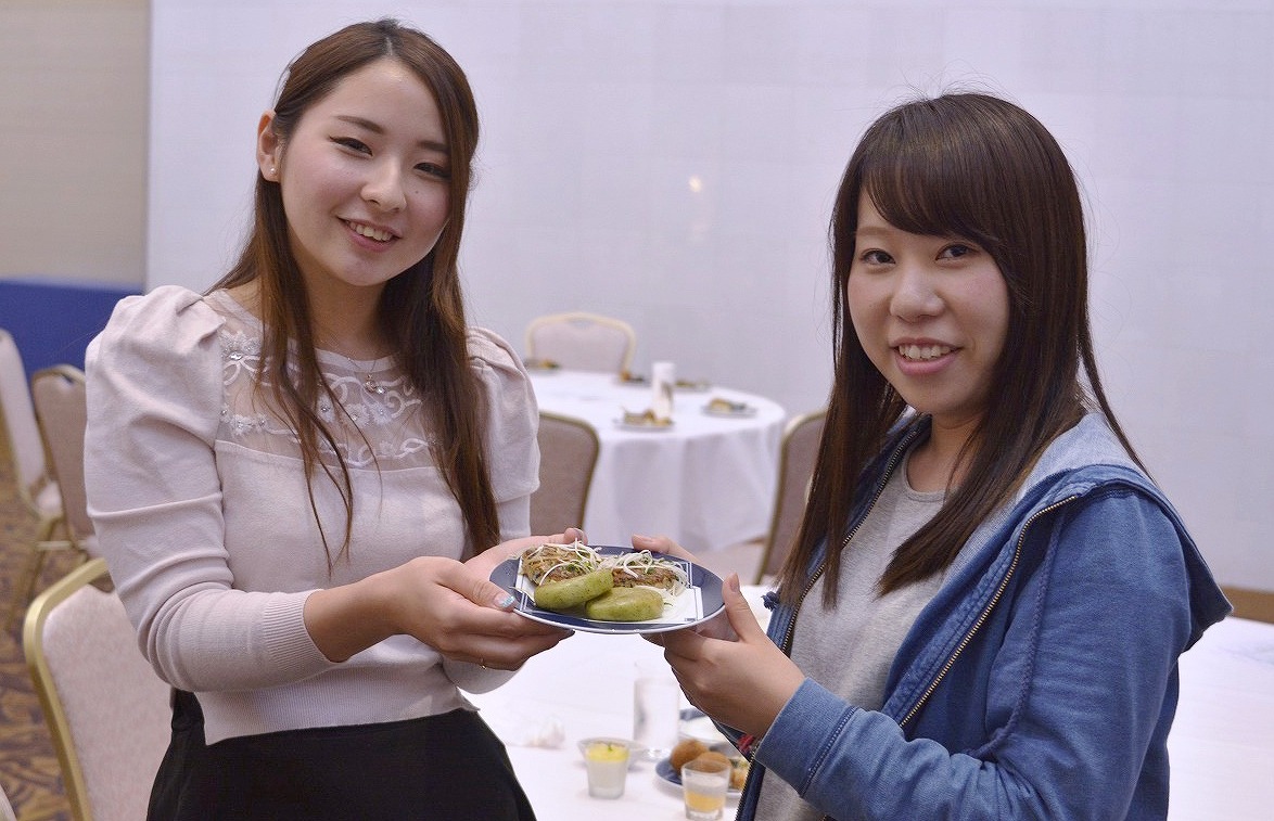 プロジェクトに参加した社会マネジメント学科3年の尾澤耀(あかり)さんと寺野友紀子さんらの班は、標津産のシャケを使った「いももち」を考案した。尾崎さんは「使える素材がシャケだけだったので苦労した。考案した料理が、プロの手で実現されてうれしい」と話していた。