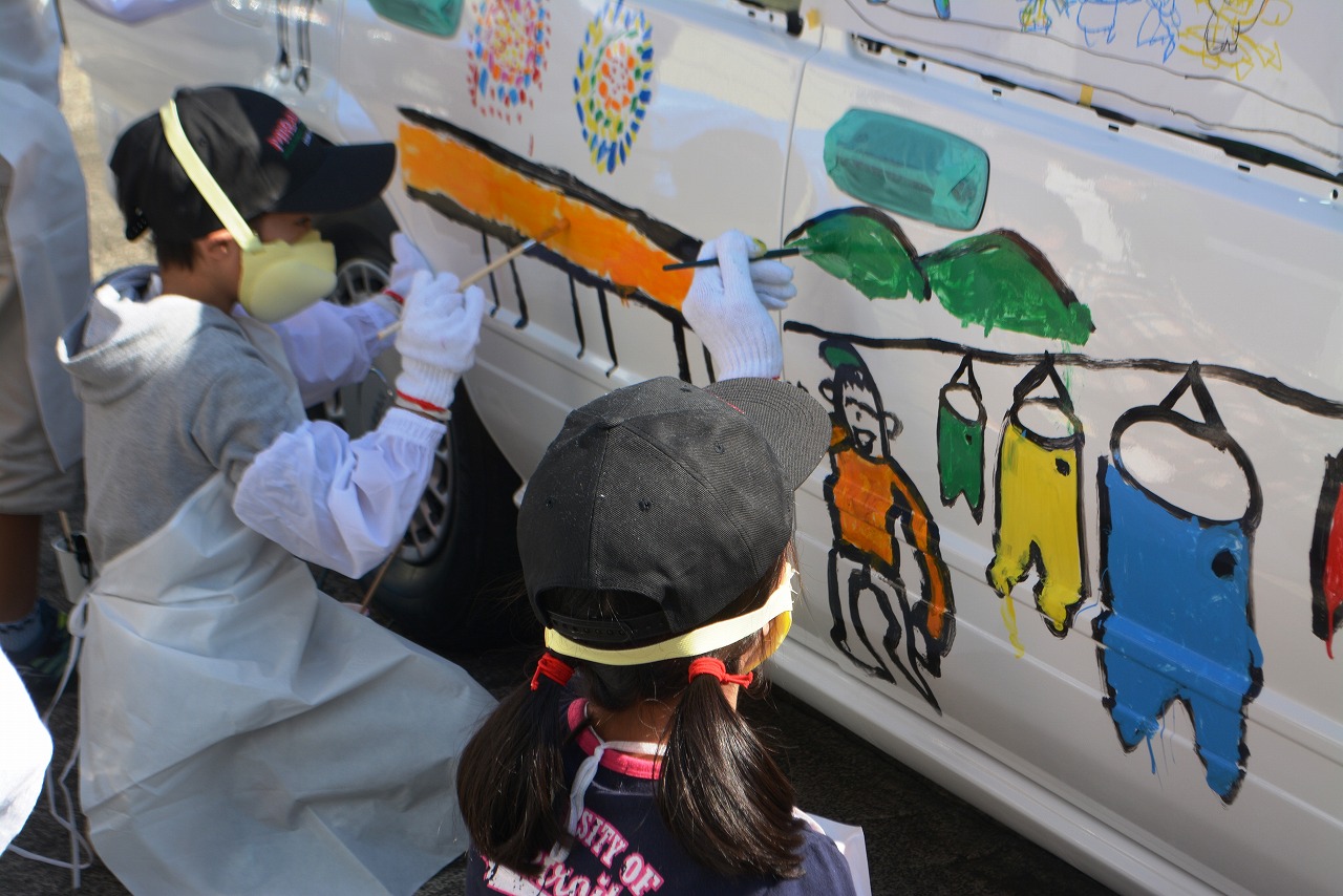 旅客自動車業の田名交通(相模原市中央区田名)は10月19日、同区宮下の自動車整備工場でタクシーのお絵かきイベントを開いた。田名小学校の特別支援学級で学ぶ児童ら9人が、相模川のこいのぼりや的祭(まとまち)など、田名の四季を車体に描いた。