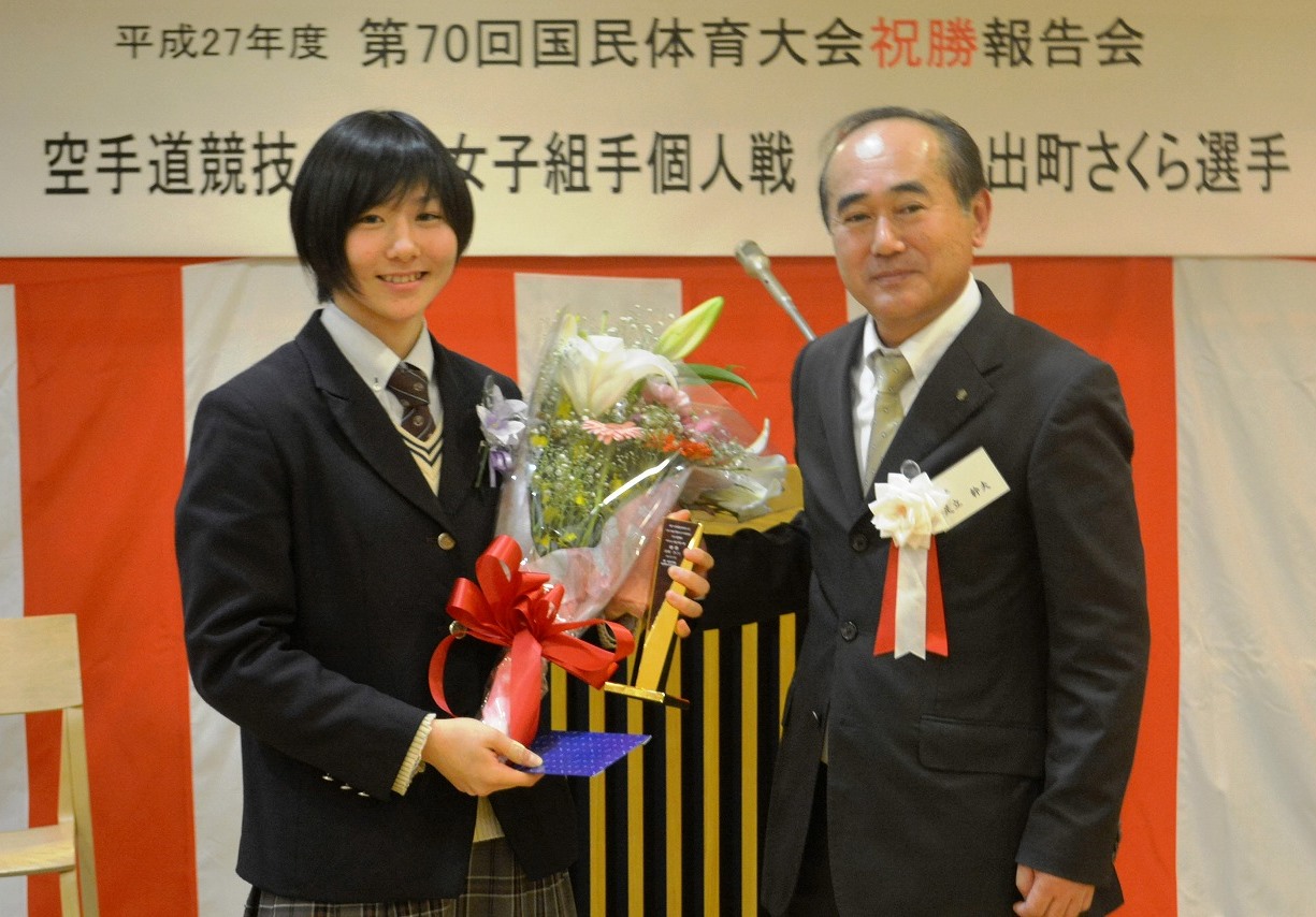 祝勝会は同高校が主催。出町選手が所属する空手部34人のほか、教職員やPTAらが参加。出町選手を祝福するとともに、今後の試合に向け健闘を誓った。
