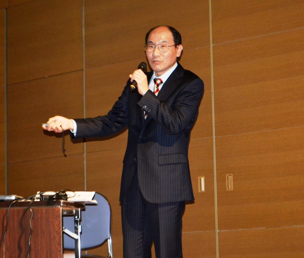 日立製作所の鉄道事業の拠点・笠戸事業所(山口県下松市)の荒川賢一副所長が、同社鉄道事業の生産改革とグローバル戦略について説明した。
