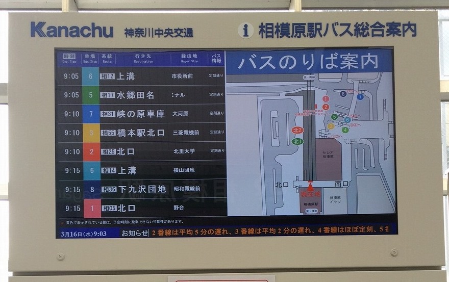 神奈中バスロケーションシステムを利用したもので、乗り場や発車時刻などを詳細かつ、リアルタイムに表示する。 同表示機は、小田急相模大野駅を出発する路線バスの運行情報を乗り場別に案内。次発情報とバス乗り場案内図を切り替えて表示できる。 (2016年3月20日号掲載)