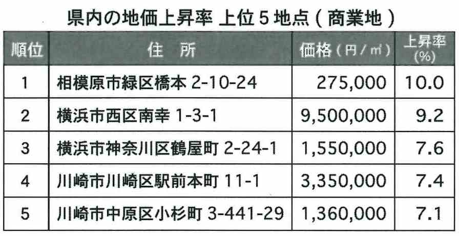 住宅地では、リニア中間駅ができる相模原市緑区が県内の上昇率上位10地点のうち4地点を占めた。利便性や将来の発展的期待感が、3区全体の上昇率を0・4%に押し上げた。