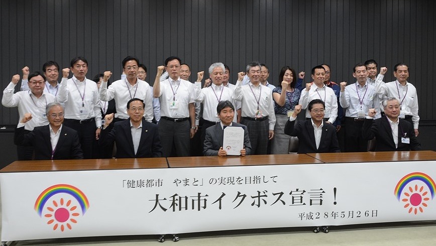 男性も仕事と子育て・介護を両立できる職場へ―。大和市はこのほど、男性職員も生活と仕事の両立できる環境を整えようと、幹部職員が「イクボス宣言」を行った=写真。市全体で「ワーク・ライフ・バランス」を実践することで「健康都市やまと」の実現を目指す。