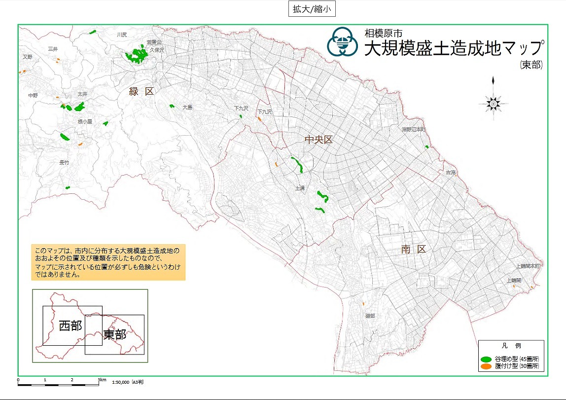 中央区では上溝周辺に集中。緑区は若葉台や久保沢、太井、根小屋の近辺で多く確認された。大規模盛土造成地の位置を示しただけで、住宅の危険性について評価したものではないという。
