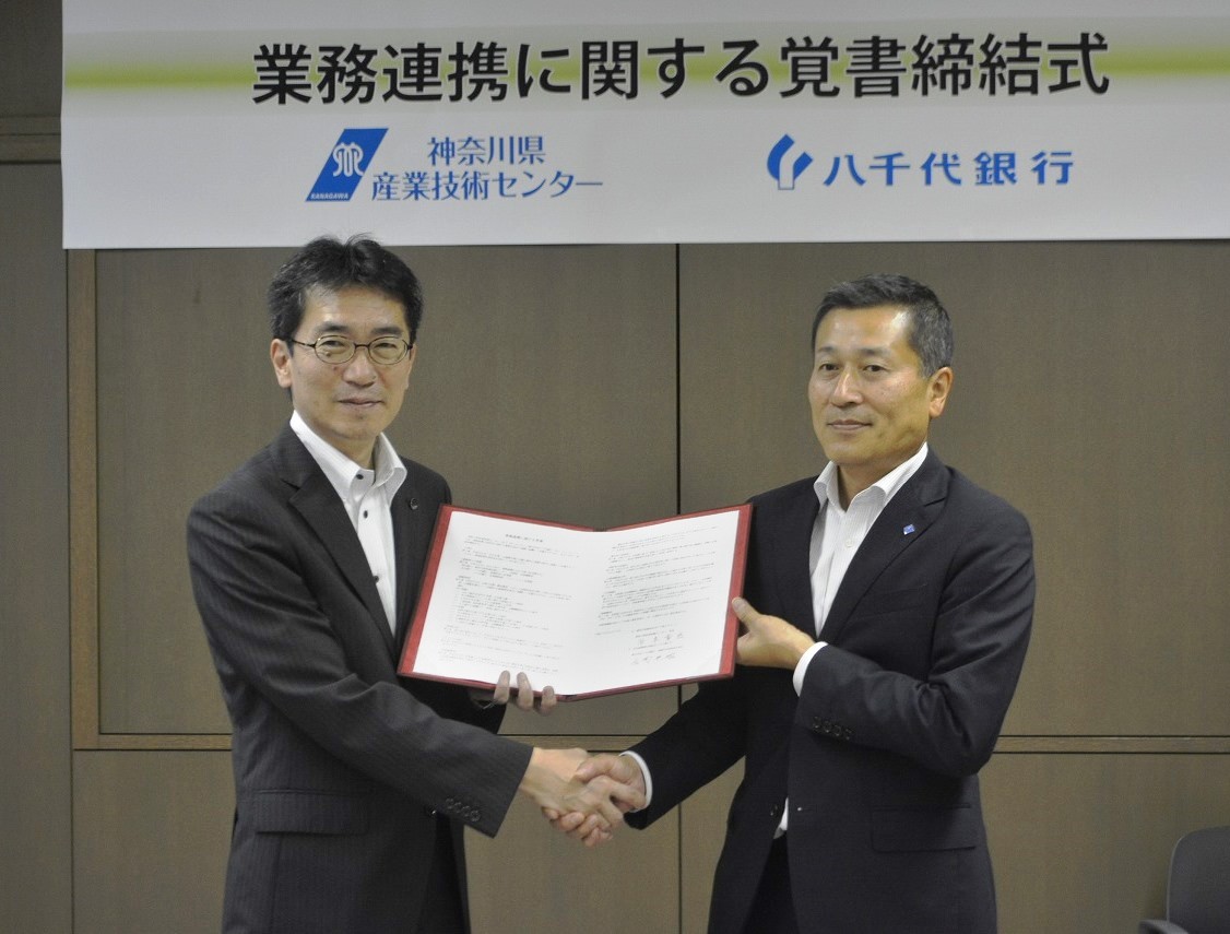 県産業技術センター(海老名市下今泉)と八千代銀行(東京・新宿)は6月23日、それぞれが持つノウハウやネットワークを相互に生かして、業務連携するための覚書を締結した。