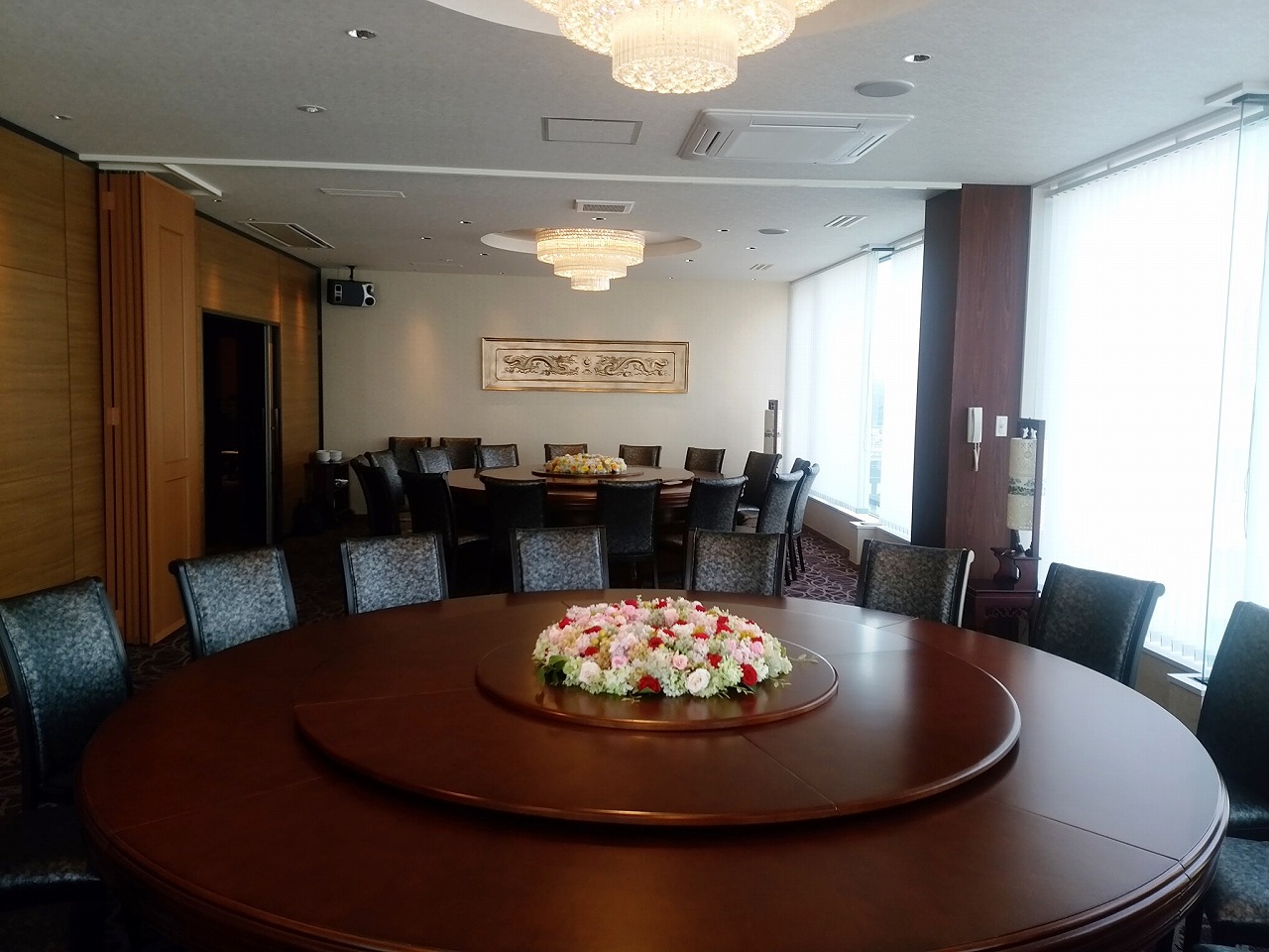 内装はミシュランで5つ星の都内ホテルの内装を手掛けた設計業者に依頼。ホテルのような高級感ある雰囲気で、4階を約100人まで対応の宴会場とし、5階を調理スペースと個室などのテーブル席とした。日本最大級という自動回転円卓や、夜景を楽しめるカップル席なども設けた。
