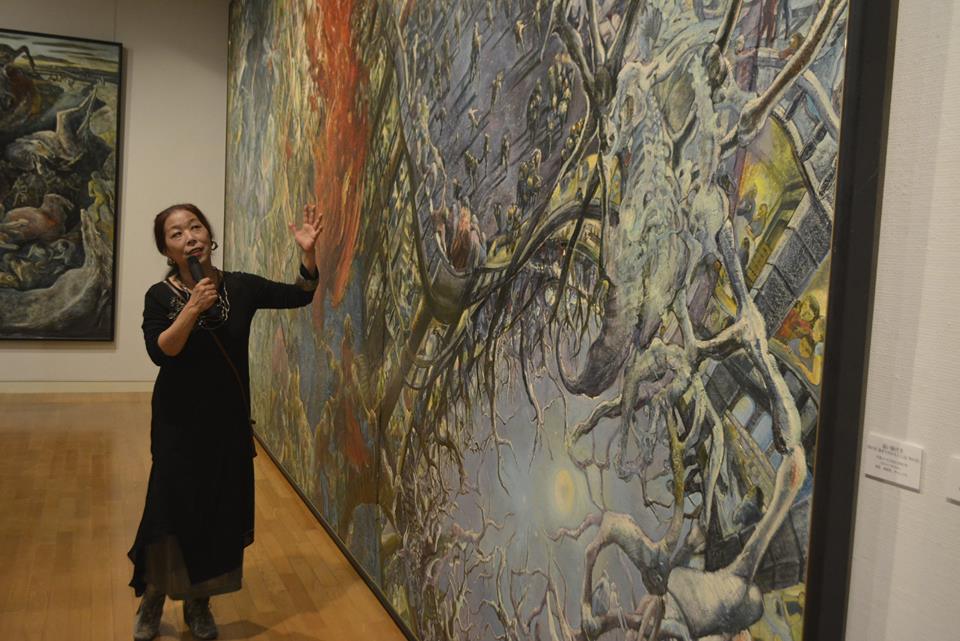 相模原市南区在住の遠藤彰子さん(68)は8月28日まで、市内で初めてとなる個展「遠藤彰子の世界展~COSMOS~」(主催・同市)をセレオ相模原内の市民ギャラリー(相模原市中央区相模原)で開いている。今回のために描き上げた1000号(333ミリ×4970ミリ)の新作『眸ひらく明日』を展示。開催を前に「より多くの市民の皆さんに作品を見てもらいたい」と話していた。