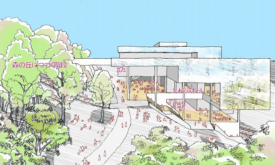 公募型プロポーザルで選定された設計案は、地形を生かす環境負荷の小さな建築や、版画美術館との相乗効果などを提案した。市街地と公園の高低差を解消するためエレベーターを設置する方針で、一般利用にも開放することで回遊性を確保するという。