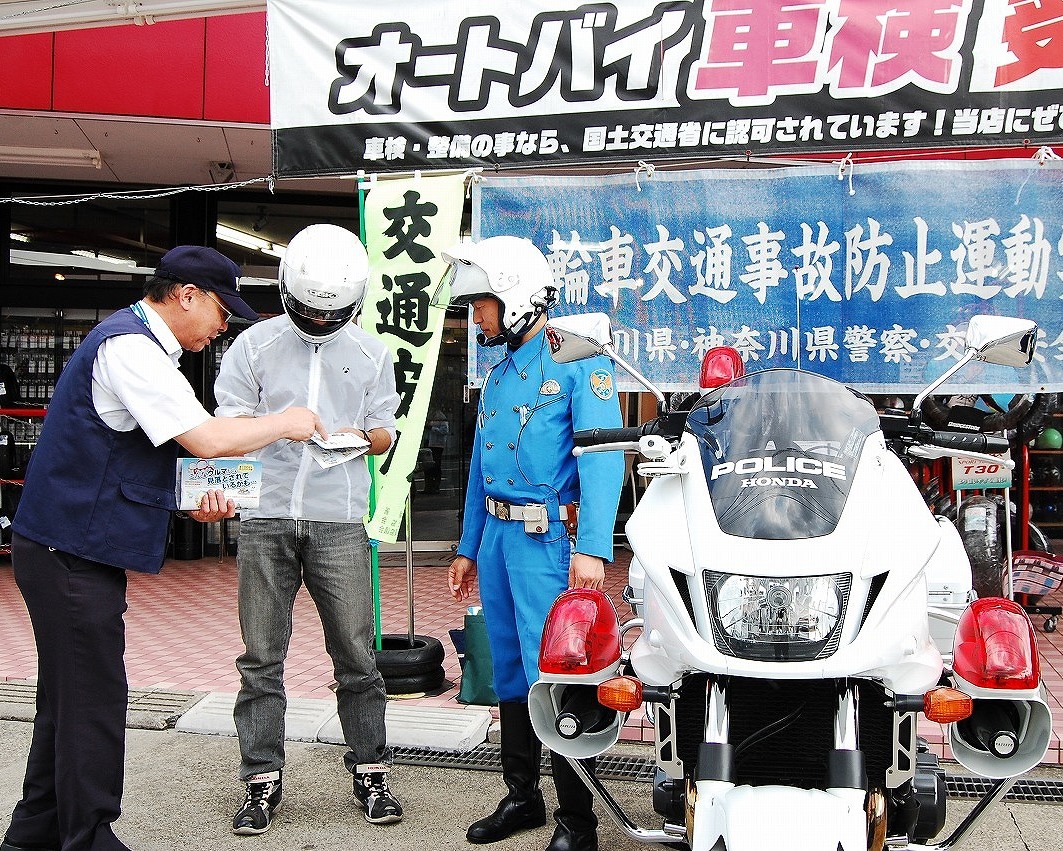 当日は相模原市中央区東淵野辺のバイク用品店に同署員と市、相模原交通安全協会の関係者6人が立ち、来店客に事故防止のチラシや反射材付きのステッカーなどを配った。