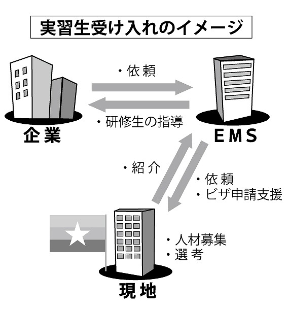 2001年の設立以降、世界10カ国以上から技能実習生の受け入れをサポートしている。ミャンマーもその一環としている。受け入れ人数は1人からでも可能。製造業の66職種、123作業で募れる。研修期間は半年から3年間。企業からの要望により、EMSの事務局が、提携している現地機関に人材募集を要請。選考して企業に派遣する。(2013年9月10日号掲載)