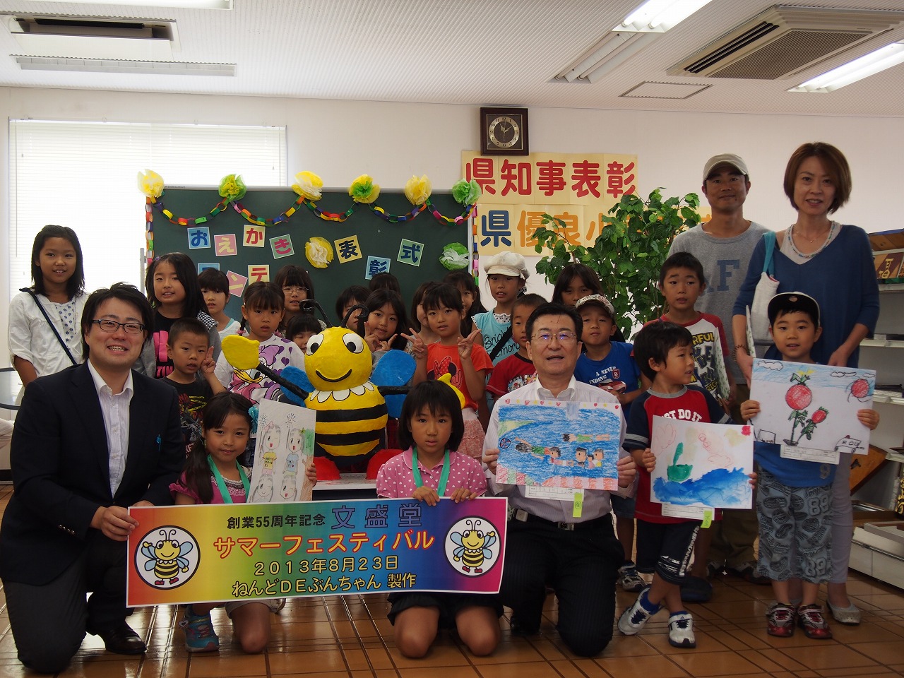 文具・事務用品機器販売の文盛堂(相模原市中央区千代田)は7日、「第6回お絵かきコンテスト」の表彰式を行った=写真。 毎年恒例のサマーフェスティバルで「夏休みの思い出」をテーマに小学6年生以下の作品を募集。専門家らが審査し、30点以上の中から小学2年生の菅原夏弥さんの作品が金賞に選ばれた。表彰式では同店の尾作晃社長から賞状の授与と記念品が贈られた。 創業55周年記念イベント「ねんどDEぶんちゃん」で製作した同店キャラクターのぶんちゃんのオブジェも披露された。(2013年9月20日号掲載)