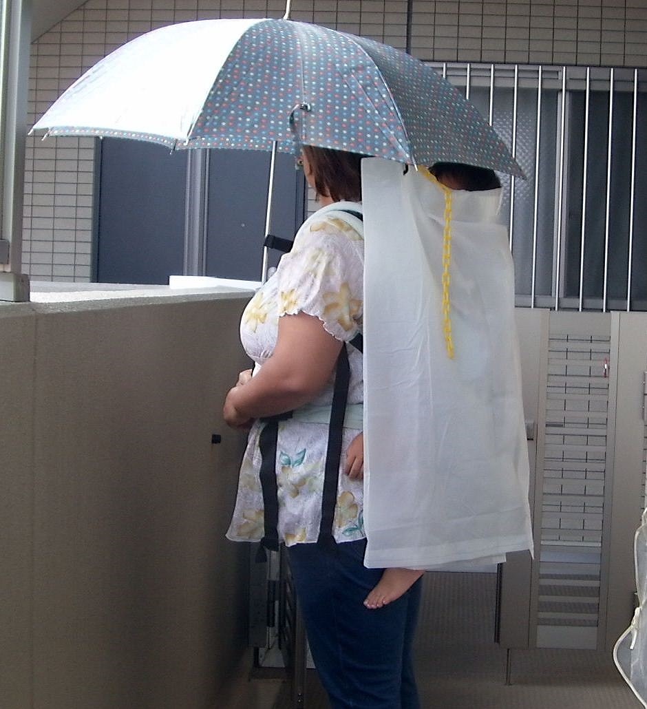 「ぬれんコート」は、傘をさす人の背中が雨にぬれないよう傘からビニールシートを垂れ下げられるようにした。