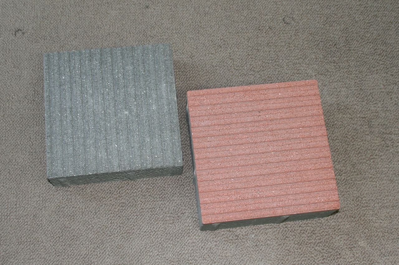 国策ブロック(模原市緑区下九沢)は、2種類の異なるスリット(溝)を入れ、滑り止め効果を高めたブロック「セーヌ200」を開発。保水性や透水性を持った種類もラインアップした。