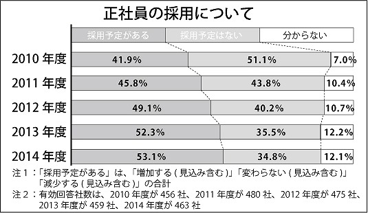 14年度の正社員採用について、採用予定があると回答した企業は、463社中246社(構成比53・1%)あった。昨年度の52・3%と比べると、わずかながら上昇している傾向がうかがえた。