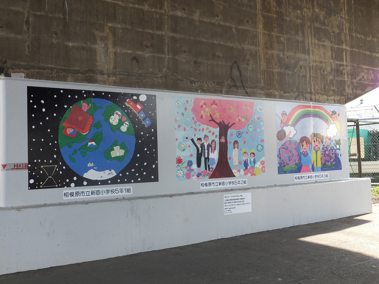 相模原塗装協同組合(志村道男理事長)はこのほど、ボランティア活動の一環として、市内の小学生らが描いた作品を上溝バイパス下橋脚に掲示した。