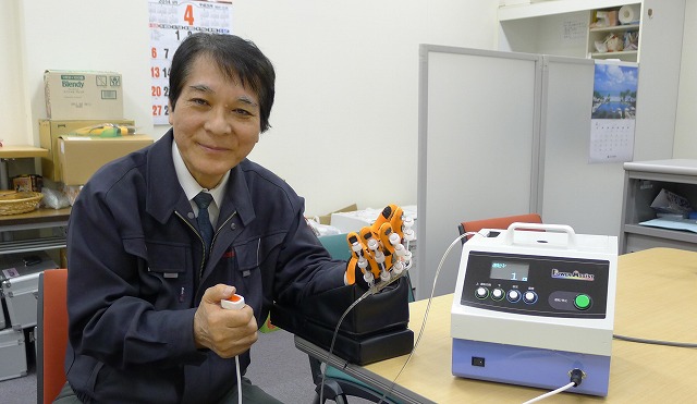 空気圧を利用して、手を握ったり開いたりする動作も補助する。麻痺している手の甲側に、ベローズ(蛇腹)が付いたグローブを装着して用いる。価格は29万8000円(税別)。