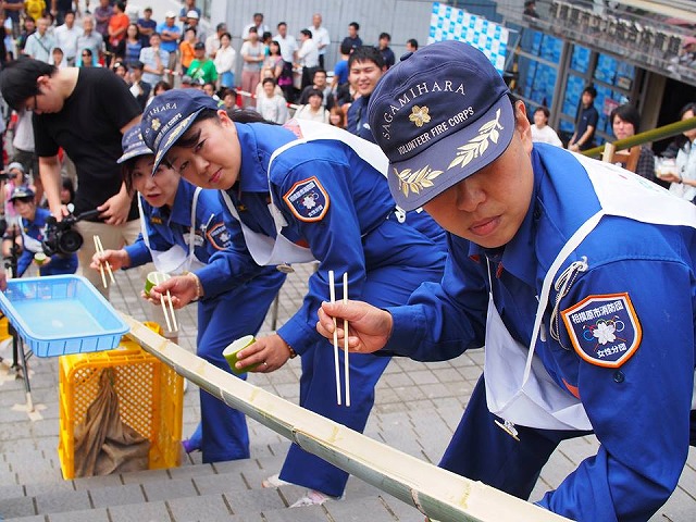 2027年開業予定のリニア中央新幹線の新駅設置が決まったことをうけ、相模原市立北総合体育館(緑区下九沢)で8月31日、流れる麺をリニアモーターカーになぞらえた「第1回流しそうめん世界大会~リニア麺で世界一に挑戦!~」が開かれた。同市の市制60周年記念事業として、相模原青年会議所(JC)が主催した。