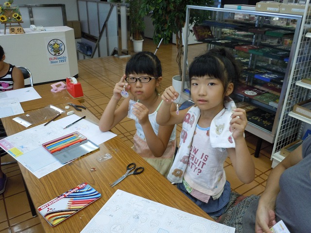 夏休みの宿題にぴったりの工作教室では、母親と一緒に参加した小学3年生の女の子がキットを使って作品を作り上げ、笑顔を浮かべた。