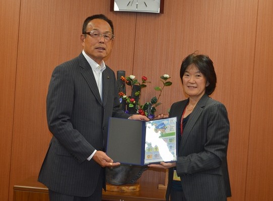 販売開始に先立ち、同支社の木下範子支社長ら7人は中央区内の市庁舎を訪れ、同切手シートの贈呈式を開催。加山俊夫市長が受け取ると、日ごろの協力に感謝の言葉を贈った。(2014年11月20日号掲載)