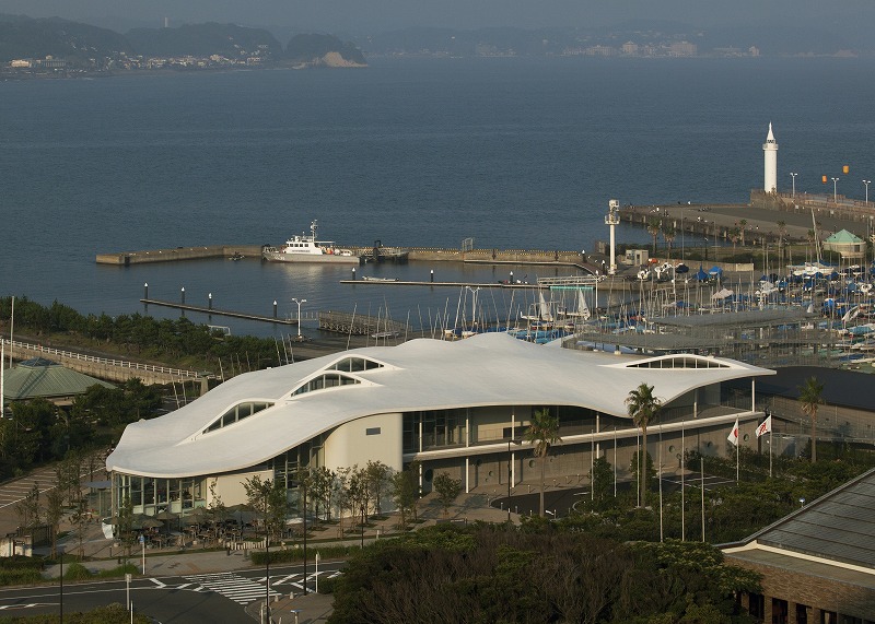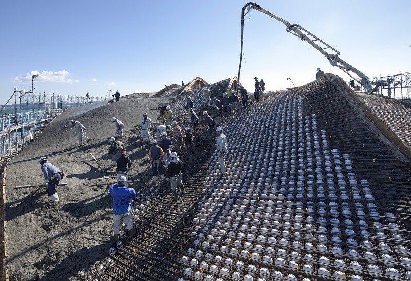 同工事は特徴的な波型の自由曲面の屋根を実現するため、極めて高度な技術が必要とされた。また、建設地が海に面していたため、激しい風雨で工事がたびたび中止になるなど、厳しい施工条件で行われた。