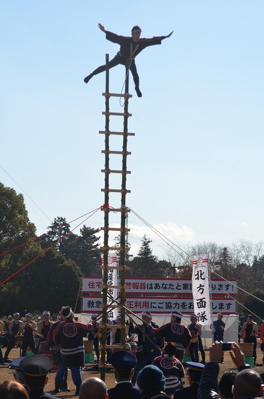 団体演技では、消防団員が江戸時代の町火消しを思わせる衣装で、しの笛や和太鼓などの演奏と唄をうたう「消防八木節」を披露。「腕用ポンプによる放水」や「はしご乗り」などの迫力ある伝統演技に、市民からの拍手が送られた。