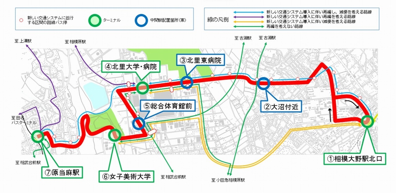 設置できない区間では優先レーンや一般レーンの走行と、柔軟に対応。相模大野駅周辺地区などでは、マイカー流入規制や交差点の改良も想定している。