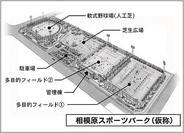 仮名称は「相模原スポーツパーク」で、誰でも気軽に利用できる駅近・身近なスポーツ・レクリエーション交流拠点がコンセプト。軟式野球場は人工芝の面積1万4000平方メートルで、外野フェンスや観客席(320席)などは移動可能なものを設置する。